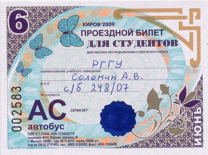 | Keywords: Kirov autobus ticket.jpg en Month bus ticket for students Kirov Kirov oblast Russia ru есячный студенческий п оездной билет на автобус Ки ов Ки овская область Россия own Alexander V Solomin / Yufereff 2009 PD-RU-exempt Buses in Kirov Public transport tickets of Russia |