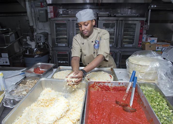 Keywords: kitchen helper table preparation preparing pizza sauce