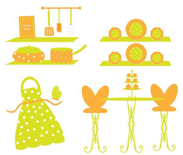Keywords: kitchen utensils apron chair chairs crockery plates green orange illustration elements design