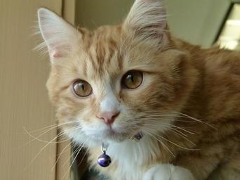 Keywords: kitten cat feline yellow red portrait watching pet nature animal close-up