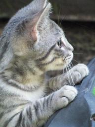 Keywords: kitten tiger gray kitty cat baby cat cute curious feline pets animals nature outdoors curiosity