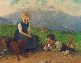 Keywords: Kleehaas Kinderpaar mit Dackel.jpg Theodor Kleehaas Kinderpaar auf einer Alm erzieht einen Dackel oil on canvas 64 x 84 5 cm http //www zeller de/ 19th or 20th century Theodor Kleehaas PD-art People with dogs in art Theodor Kleehaas Dachshunds in art Children with animals in art Images from Auktionshaus Zeller