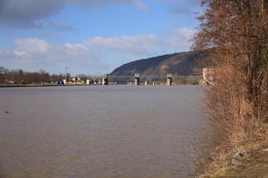 Keywords: Klingenberg Staustufe und Brücke.JPG de Die Klingenberger Staustufe mit Schleuse links und Wasserkraftwerk rechts im Hintergrund die Mainbrücke Own Tilman AB 2009-02-14 Staustufe Klingenberg Mainbrücke Klingenberg