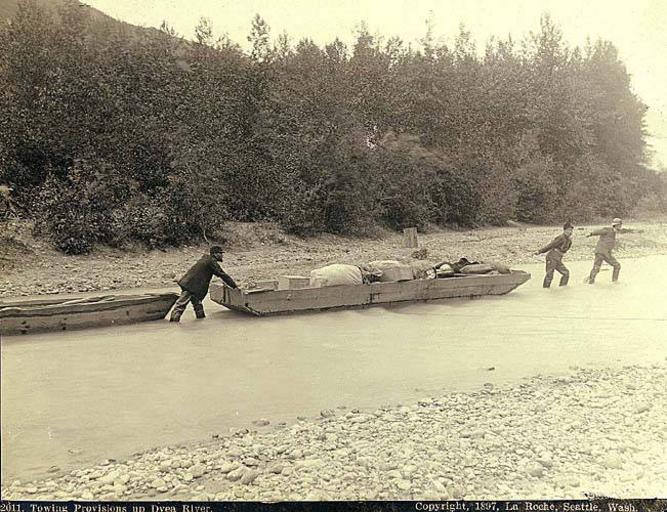 | Keywords: Klondikers towing supplies up Dyea River using flat bottomed boat, Chilkoot Trail, Alaska, 1897 (LAROCHE 308).jpeg Photograph Creator Frank La Roche Caption on image Towing provisions up Dyea River c1897 Twelve hundred pounds are here loaded upon a flat-bottomed boat which is being pulled and pushed upstream to the head of canoe navigation about six miles north of Dyea It exhibits another method of moving supplies With indescribable toil hundreds of men labored on from day to day in an almost frenzied effort to reach Dawson City before the freezing of the lakes and rivers beyond the mountain passes; and in their desperation at the slow process made some would abandon their outfits and push on trusting to luck and a well-filled purse to take them through while others would cache their supplies with the hope of finding them again if compelled to turn back Frank La Roche En Route to the Klondike 1898 Klondike Gold Rush Subjects LCTGM Flatboats--Alaska; Rivers--Alaska Subjects LCSH Chilkoot Trail; Trails--Alaska; Dyea River Alaska depicted place Alaska 1897 Institution University of Washington UWASH-LAROCHE-source accession number laroche 308 PD-old-auto-1923 1936 Information field Order Number LAR203 Flatboats Taiya River Chilkoot Trail Trails |