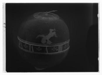 Keywords: Klotur - Livrustkammaren - 35359-negative.tif Klotformigt ur med loddrift där urhuset utgör lodet Sammansatt av tre delar 1 undre halvan av slät förgylld koppar blytyngd på bottnens insida på utsidan cirkelformig tavla av mässing med sifferring av silver graderad I-XII visare av stål I överkanten 4 hål för fastskruvning av urveket 2 Övre halvan likaså av förgylld koppar upptill hank med nitade öglor allt av mässing Vid hanken 4 skruvhål samt rektangulärt hål 13x7 mm <br/><br/>I nederkanten rund silverplatta graderad 1-3 4 syns ej med hål för uppdragningsaxel 3 Urverk nästan helt av mässing med roterande förgylld sifferring graderad I-XII synlig mellan de två halvorna visare i form av ängel fastskruvad vid nedre halvan Uret hänger i vaxat snöre upplindat runt spiralaxel i snörets andra ände tillplattad oval ring av mässing På övre halvan märkning med röd färg 3937 original caption klotur - LRK 191 ca 1700 steel - silver - brass - copper - lead g 1251 size mm 119 108 LRK Stanislaus I av Polen kung Människan och tiden 1989 Människan och tiden 1990 Kunglig tid 1999 place of origin original filename LN_B08274_011154 36768 inventory number LRK 191 35359 CC0 Klotur - Livrustkammaren - 35359 tif |