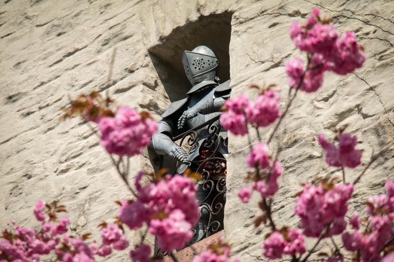 Keywords: knight armor ritterruestung middle ages metal harnisch castle wall eifelburg bad münstereifel cherry blossom cherry historically guard japanese cherry trees eifel