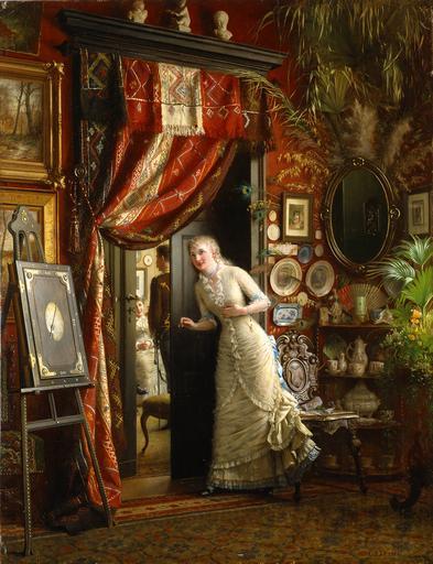 Keywords: Knut Ekwall-Frieriet.jpg Artwork Creator Knut Ekwall 1880-1889 oil canvas Institution Nordiska museet Stockholm Sweden accession number object history credit line overdecorated Victorian interior woman joyfully eavesdropping www nordiskamuseet se PD-old-auto 1912 Knut Ekwall Marriage proposals in paintings People with mirrors in art Easels in art Women in rooms in art Eavesdropping in art Woman's clothes and fashion in painting 19th-century domestic interiors in painting 1880s 1880s paintings Images from Nordiska museet Red curtains in art |