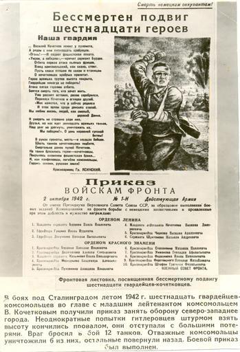 | Keywords: Kochetkov leaflet.jpg ru Ф онтовая листовка посвящённая подвигу В Д Кочеткову и его подчинённым Листовка издана в 1942 году во в емя Сталинг адской битвы 2014-10-16 11 09 59 http //www penza-km ru/ Пензенский областной к аеведческий музей файл п едоставил ди екто музея Зименков В author файл п едоставил ди екто музея Зименков В для азмещения в википедии other versions Custom license marker 2014 10 16 PD-Russia Uploaded with UploadWizard Battle of Stalingrad People associated with World War II from the Soviet Union Kochetkov Vasily Dmitrievich |