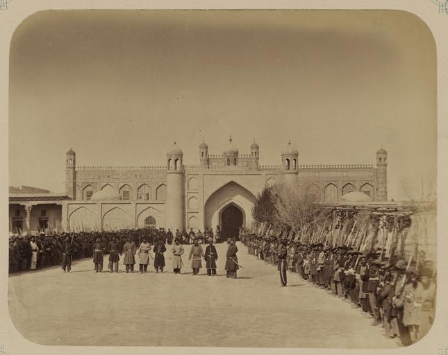 Keywords: Kokand Khanate. Gate of the Kokand Palace in the City of Kokand. Soldiers of the Kokand Khan's Army Standing in the Interior Courtyard of the Palace WDL10731.png Artwork ru Кун Александ Людвигович 1840 1888 гг fr Kun Aleksandr L 1840-1888 en Kun Aleksandr L 1840-1888 zh 亚历山大·L· ,1840-1888 年 pt Kun Aleksandr L 1840-1888 ar كُن، ألكسندر ل ، 1840-1888 es Kun Aleksandr L 1840-1888 ru Кокандское ханство Во ота ханского дво ца в го оде Коканде Солдаты а мии кокандского хана стоят во внут еннем дво е дво ца fr Khanat de Kokand Porte du palais de Kokand dans la ville de Kokand Soldats de l'armée du khan de Kokand dans la cour intérieure du palais en Kokand Khanate Gate of the Kokand Palace in the City of Kokand Soldiers of the Kokand Khan's Army Standing in the Interior Courtyard of the Palace zh 浩罕汗国 浩罕城浩罕宫殿大门 守卫 宫殿内部庭院中的浩罕汗军队士兵 pt Canato de Kokand Portão do palácio de Kokand na cidade de Kokand Soldados do exército do khan de Kokand em pé no interior do pátio do palácio ar خانات خوقند بوابة قصر خوقند في مدينة خوقند جنود جيش خان خوقند وهم واقفون في الفناء الخارجي للقصر ru Эта фотог афия входит в этног афическую часть <em> Ту кестанского альбома </em><em></em> всесто оннего исследования Цент альной Азии п едп инятого после того как в 1860-х годах в егионе установилось господство Российской импе ии Альбом созданный по аспо яжению гене ала Константина Пет овича фон Кауфмана 1818 1882 годы пе вого гене ал-губе нато а оссийского Ту кестана состоит из четы ех частей в шести томах «Часть а хеологическая» два тома «Часть этног афическая» два тома «Часть п омысловая» один том и «Часть исто ическая» один том Основным составителем альбома был оссийский востоковед Александ Людвигович Кун аботавший совместно с иколаем Венедиктовичем Богаевским В альбоме п едставлено около 1200 фотог афий а также а хитекту ные планы аква ельные исунки и ка ты «Часть этног афическая» включает в себя 491отдельную фотог афию на 163 листах а фотог афиях изоб ажены п едставители азличных на одов егиона листы 1 33 повседневная жизнь и итуалы листы 34 91 а также виды де евень и го одов уличные то говцы и комме ческая деятельность листы 92 163 <br>Замки и дво цы; Этног афические фотог афии; Исламская а хитекту а; Ко оли и п авители; Фотог афические исследования; Солдаты fr Cette photographie est extraite de la partie ethnographique de l'<em>Album du Turkestan</em> étude visuelle complète de l'Asie centrale entreprise après que l'Empire russe prit le contrôle de la région dans les années 1860 Commandé par le général Konstantin Petrovich von Kaufman 1818 1882 premier gouverneur général du Turkestan russe l'album est composé de six volumes en quatre parties la partie archéologique deux volumes la partie ethnologique deux volumes la partie sur les métiers un volume et la partie historique un volume L'album fut essentiellement compilé par l'orientaliste russe Aleksandr L Kun assisté de Nikolai V Bogaevskii Il comporte près de 1200 photographies et inclut également des plans architecturaux des dessins à l'aquarelle et des cartes La partie ethnographique compte 491 photographies sur 163 planches montrant des individus des différentes peuplades de la région planches 1 à 33 des scènes de la vie quotidienne et des rites planches 34 à 91 ainsi que des vues de villages et de villes de vendeurs ambulants et d'activités commerciales planches 92 à 163 <br>Châteaux et palais; Photographies ethnographiques; Architecture islamique; Rois et dirigeants; Inventaires photographiques; Soldats en This photograph is from the ethnographical part of <em>Turkestan Album</em><em> </em>a comprehensive visual survey of Central Asia undertaken after imperial Russia assumed control of the region in the 1860s Commissioned by General Konstantin Petrovich von Kaufman 1818 82 the first governor-general of Russian Turkestan the album is in four parts spanning six volumes Archaeological Part two volumes ; Ethnographic Part two volumes ; Trades Part one volume ; and Historical Part one volume The principal compiler was Russian Orientalist Aleksandr L Kun who was assisted by Nikolai V Bogaevskii The album contains some 1 200 photographs along with architectural plans watercolor drawings and maps The Ethnographic Part includes 491 individual photographs on 163 plates The photographs show individuals representing the different peoples of the region Plates 1 33 ; daily life and rituals Plates 34 91 ; and views of villages and cities street vendors and commercial activities Plates 92 163 <br>Castles and palaces; Ethnographic photographs; Islamic architecture; Kings and rulers; Photographic surveys; Soldiers zh 这张照片出自<em> 其斯 相册 </em>的民族部分,该相册是俄罗斯 国 19 世纪 60 年代取得中亚控制 后, 手制 的