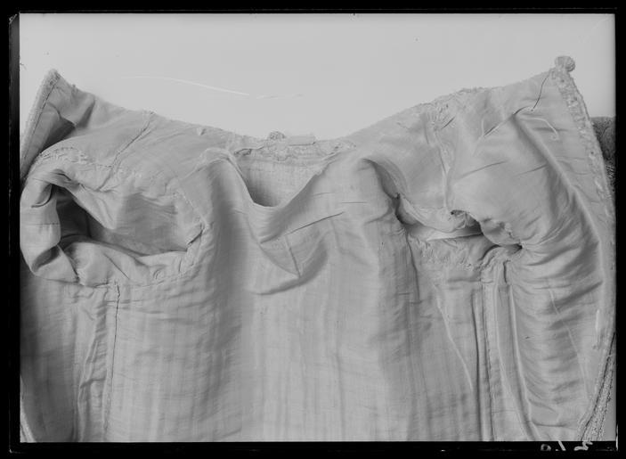 | Keywords: Kolt, Karl XI - Livrustkammaren - 44557.tif LSH artwork sv Klänning av purpurfärgad gyllenduk med bårder av silver och guldbroderi silverblommor l lövverk av guld Höjd från axel och ned 95 cm Lös ståndkrage höjd fram 4 5 cm bak 3 cm Klänningen består av ett markerat 30 cm långt liv med 6 små skörtflikar varav de 2 främre gå i ett med framstycket Kjolen som börjar framtill i midjan är här 64 5 cm lång och bak 69 cm Den lösa ståndkragen är fastknäppt med 4 knappar fram bak och en på varje axel av trä Ursprungligen knäpptes kragen framtill med 2 knappar men den ena har fallit bort På kragen finnas 5 öglor för fastsättning Kjolen är i nederkanten broderad med en 9 5 cm bred bård mitt fram äro 2 sådana bårder broderade vertikalt från midjan och ner till kantbården Kjolens omkrets nertill är 237 cm Kjolen är sydd av 5 st 45 5 cm breda våder synlig vidd 2 våder stöta mot varandra mitt fram Mitt bak har kjolen ett 25 cm långt sprund från midjan en våd har sprättats upp i mitten I sidsömmarna ha 2 fickor med vardera 13 cm långt sprund passats in underkanten av ficksäcken sitter 34 5 cm från kjolens nederkant <br/>Livet har broderats med smalare bårder; fram c a 5 5 cm bred med markerad mittrad samt c a 2 8 cm breda bårder markerande falsk sidsöm från axeln och ner så att avslutningen bildas i de 2 främsta skörten Livet snöres samman baktill med 16 snörhål 26 cm Under midjeskörten löper runt hela midjan bandrosetter silverband med rosa inslag bildande 2 öglor och 2 band tampar i varje grupp Bandöglorna äro c a 12 cm långa varje ögla 6 x 12 t 72 cm Inalles är det 46 rosetter som alltså dragit en ungefärlig längd band av 33 12 meter Den flätade snodd av guld och silvertråd som snör samman livet i ryggen är 102 cm lång och i ena änden finns den urspr 2 cm lång doppskon kvar <br/>De 2 korta ärmarna äro framtill öppna längd fram 18 5 cm De ha utefter de öppna kanterna vertikalt broderade bårder som dräkten i övrigt 7 st rosettgrupper äro fastsydda nertill på varje ärm Vid ärmarnas bakre söm äro 2 hängband Flügelärmar fastsatta De äro 56 57 cm långa resp V och H och 9 6 cm breda De äro broderade på utsidan såsom bårderna i övr och på undersidan fodrade med gyllenduken 8 5 cm från nederkanten har 3 grupper bandrosetter öglorna äro nu c a 12 cm långa fastsatts Hänghandens främre sida börjar vid axelsömmen Framsidan är något längre än den bakre då sömmen är något sned Flügelärmarna äro en rest från det spanska dräkt modet som eg upphör omkr 1625 Dessa kunde bara ifrågakomma när man hade styvt snörliv <br/>Klänningen är helt fodrad med purpurfärgad nu blekt taft Troligen har samma tyg begagnats som grund för de broderade partierna Fodrets vådbredd är 105 cm 62 varptr x 44 insltr/cm2 Skörtflikarna äro fodrade med taft C a 1 95 2 cm under skört flikarnas fästsöm vid livet ha bandrosetterna sytts fast 26 bandgrupper runt midjan något ojämnt placerade Under det V midjeskörtet baktill sitter en knapp trol placerad för värjgehängets skull Den sitter cm från midjan och 6 5 cm från sömmen mitt baktill Knapparna äro små halvklotformiga träknappar med ett hål tvärs igenom klädda med silver och guldtråd Diam Höjd<br/>Å kjolens mittvåd baktill har man inte brytt sig om att öka i något stycke i midjan utan nöjt sig med den 68 cm långa våden och blott låtit underfodret gå ner i livet och detta sitter bart ett stycke under skörtflikarna I midjan under livets nederkant har men till foder begagnat samma ljusare tyg som begagnats till underlag på de broderade partierna som alltså aldrig sytts genom brokaden I midjan mitt bak under snörningen knäppes livet med en urspr hyska och en ny hake I midjan är foderskarven 3 5 5 5 cm bred inre midjemått 51 cm Livet är styvt genom foder av kanfas och fiskben <br/>Guldbrokaden har en vådbredd av c a 51 cm Den är vävd med inslag av guldtrådar guldlan spunna över gult silke och silvertrådar silverlan spunna över vitt silke samt platta silverlan och varp av purpurfärgat otvinnat silke Mönsterrapport höjd 6 cm bredd 4 cm mönster blommor av silver bladverk av guld Sidenbanden äro 14 mm breda och vävda av vitt silke smala silverlansomspunna trådar och smala platta silverlan samt rosa silkestrådar i varpen; glest inslag av smala silveromspunna trådar 14 insltr/cm original caption Karl XI s kungahyllning ca 1660 size mm 950 från axel LRK Karl XI av Sverige Kungligt klädd 1987-1989 Sweden - A Royal Treasury 1988-1989 Kunglig barnkammare 1995 Modelejon 2002 Sweden and Europe 1632-1792 2003-2004 Dödens teater 2015 Livrustkammaren Ryssland och Sverige under 1600-talet Från Karl XI s ungdom place of origin original filename LN_B14675_017555 67904 inventory number LRK 31311 44557 CC0 Kolt Karl XI - Livrustkammaren - 44557-negative tif <gallery caption Different images of same object > File Karl XI av Sveriges kolt från 1660 cirka - Livrustkammaren - 64523 tif File Kolt ägd av Karl XI tygdetaljer - Livrustkammaren - 13803 tif File Karl XIs barnkläder från 1660 - Livrustkammaren - 55962 tif File Ceremoniell barndräkt buren av Karl XI - Livrustkammaren - 13795 tif </gallery> Sami clothing Media contributed by LSH unmatched event Media contributed by LSH 2014-11 |