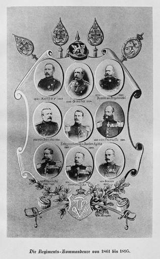 Keywords: Kommandeure 5. Badisches Infanterieregiment 113.jpg Die Regimentskommandeure von 1861 bis 1895; in der Mitte der damalige Erbgroßherzog Friedrich von Baden ab 1907 als Friedrich II Großherzog von Baden der das Regiment von 1889 bis 1891 führte Geschichte des 5 Badischen Infanterie-Regiments Nr 113 1896 Schilling von Canstatt PD-old PAD_4802 pef Jömi 201105 5 Badisches Infanterie-Regiment Nr 113 Frederick II Grand Duke of Baden 19th-century portrait photographs of men at bust length Black and white portrait photographs of military people in uniform |