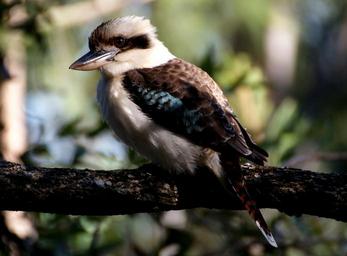 Keywords: kookaburra bird perched outdoors portrait nature australia wildlife feathers branch forest dacelo kingfisher close up laugh