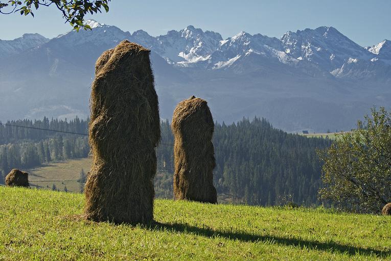 Keywords: kopki hay grass skoszona grass drying shadows of the nature forest mountains landscape grass sunny field hay autumn last swath tatry podhale stacks of hay the silence