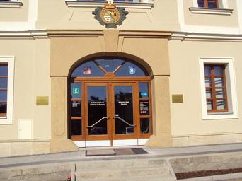 | Keywords: Koruna Žandov detail.jpg cs Vchod do historického domu Koruna na náměstí od podzimu 2010 radnice města Žandov nad vchodem erb zákupské kněžny own Zákupák 2010-10-08 50 42 50 221 N 14 23 47 607 E region CZ Žandov Česká Lípa District Town halls in Česká Lípa District |
