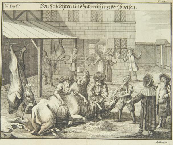 | Keywords: food preparation foodpreparation ritesandcustoms ritesandceremonies jewish jews leobaeckinstitute architecture monochrome Description: Illustration from Juedisches Ceremoniel, a German book published in 1724. The book is a beautifully illustrated description of Jewish religious ceremonies, rites of passage and feast days, which first appeared in 1716, here in its second edition of 1724. The extremely detailed plates, by Georg Puschner, depict priestly robes, the celebrations of the New Year, Passover, the weekly Sabbath, circumcision, presentation of the first born, prayer at the synagogue, a wedding procession and a wedding, purification of the bride, the washing of the brother-in-law's feet, the feast of reconciliation, death rites, burials, as well as the procedures for other Jewish customs. Read the entire book Creator: Kirchner, Paul Christian Creator: Jungendres, Sebastian Jacob, 1684-1766 Creator: Puscher, Georg Object Origin: Nürnberg, published by Peter Conrad Monath Persistent URL: digital.cjh.org/R/?func=dbin-jump-full&amp;object_id=139313 Repository: Leo Baeck Institute, 15 West 16th Street, New York, NY 10011 Call Number: r BM 700 K57 1724 Rights Information: No known copyright restrictions; may be subject to third party rights. For more copyright information, click here. See more information about this image and others at CJH Digital Collections. Digital images created by the Gruss Lipper Digital Laboratory at the Center for Jewish History Description: Illustration from Juedisches Ceremoniel, a German book published in 1724. The book is a beautifully illustrated description of Jewish religious ceremonies, rites of passage and feast days, which first appeared in 1716, here in its second edition of 1724. The extremely detailed plates, by Georg Puschner, depict priestly robes, the celebrations of the New Year, Passover, the weekly Sabbath, circumcision, presentation of the first born, prayer at the synagogue, a wedding procession and a wedding, purification of the bride, the washing of the brother-in-law's feet, the feast of reconciliation, death rites, burials, as well as the procedures for other Jewish customs. Read the entire book Creator: Kirchner, Paul Christian Creator: Jungendres, Sebastian Jacob, 1684-1766 Creator: Puscher, Georg Object Origin: Nürnberg, published by Peter Conrad Monath Persistent URL: digital.cjh.org/R/?func=dbin-jump-full&object_id=139313 Repository: Leo Baeck Institute, 15 West 16th Street, New York, NY 10011 Call Number: r BM 700 K57 1724 Rights Information: No known copyright restrictions; may be subject to third party rights. For more copyright information, click here. See more information about this image and others at CJH Digital Collections. Digital images created by the Gruss Lipper Digital Laboratory at the Center for Jewish History <strong>Description: </strong>Illustration from Juedisches Ceremoniel, a German book published in 1724. The book is a beautifully illustrated description of Jewish religious ceremonies, rites of passage and feast days, which first appeared in 1716, here in its second edition of 1724. The extremely detailed plates, by Georg Puschner, depict priestly robes, the celebrations of the New Year, Passover, the weekly Sabbath, circumcision, presentation of the first born, prayer at the synagogue, a wedding procession and a wedding, purification of the bride, the washing of the brother-in-law's feet, the feast of reconciliation, death rites, burials, as well as the procedures for other Jewish customs.