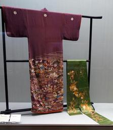 Keywords: Kosode and obi, view 1, Edo period, 19th c. - kosode, house, fan, and landscape design on purple chirimen crepe background - obi, autumn grass design on light green satin ground - Tokyo National Museum - DSC06015.JPG en Exhibit in the Tokyo National Museum Tokyo Japan This artwork is old enough so that it is in the public domain 2013-09-03 00 27 48 own Daderot cc-zero Kosode in the Tokyo National Museum Uploaded with UploadWizard Chirimen |