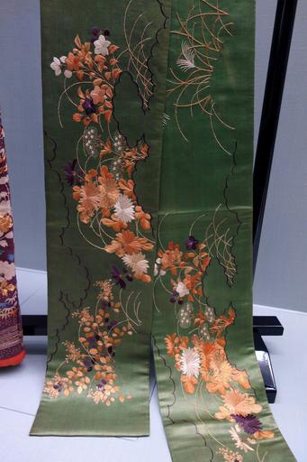 Keywords: Kosode and obi, view 3, Edo period, 19th c. - kosode, house, fan, and landscape design on purple chirimen crepe background - obi, autumn grass design on light green satin ground - Tokyo National Museum - DSC06019.JPG en Exhibit in the Tokyo National Museum Tokyo Japan This artwork is old enough so that it is in the public domain 2013-09-03 00 28 14 own Daderot cc-zero Kosode in the Tokyo National Museum Uploaded with UploadWizard Chirimen |