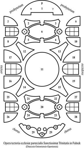 | Keywords: Kostel NejsvÄ›tÄ›jšà Trojice (Fulnek) – frs-000.svg Schema rozloženà nástropnÃch fresek v lodi kostela NejsvÄ›tÄ›jšà Trojice ve Fulneku ÄŒesko Evropa Scheme of ceiling fresco composition in the bay of the Most Holy Trinity Church in Fulnek Czechia Europe Skemo de plafonfreska kompono en la navo de la kirko de la Plej Sankta Triunuo en Fulnek ĈeÄ¥ujo EÅropo VolnÄ› pÅ™ekresleno ze starého obrázku neznámého autora Freely redrawn secundum an old image by unknown author Libere desegnita laÅ malnova bildo de nekonata aÅtoro created with Inkscape 2011-05-01 ucfirst anonymous original User Petrus Adamus/author vectorization DerivativeVersions Kostel NejsvÄ›tÄ›jšà Trojice Fulnek “ frs-000-k svg Kostel NejsvÄ›tÄ›jšà Trojice Fulnek “ frs-popis pdf Frescos of the Most Holy Trinity Church Fulnek Plans of churches in the Czech Republic Floor plans of churches |