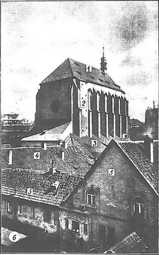 Keywords: Kostel Panny Marie Sněžné, 1930.jpg cs Pohled na kostel a konvent Panny Marie Sněžné v Praze z roku 1930 1930 František Klement Minařík OFM Pražští mučedníci Serafín Bratislava 1991 str 6 neznámý 1930 ; unknown 1930 legenda 1 kostel 2 schody nad klenbou kostela 3 kaple Panny Marie sv Michaela 4 tehdejší noviciát 5 konvent 6 nádvoří PD-Art Fourteen Prague Martyrs Church of Our Lady of the Snow Prague Uploaded with UploadWizard