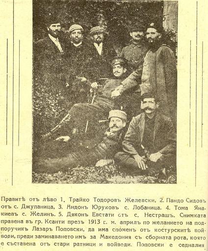 | Keywords: Kostur-MAVC-1913.JPG Косту ски войводи снимани п ез ап ил 1913 година в Ксанти п еди заминаването на Сбо ната па тизанска ота на акедоно-од инското опълчение П ави Т айко Желевски от Желево Пандо Сидов от Жупанища Андон Ю уков от Лабаница Тома Янакиев от Желин и Гео ги Шко нов Дякон Евстатий от ест ам Седналият е подпо учик Лаза Поповски Илюст ация Илинден 1913-04 Author Anonymous-EU IMARO Revolutionaries from Bulgaria Pando Sidov Georgi Shkornov Trayko Zhelevski Toma Zhelinski Macedonian-Adrianopolitan Volunteer Corps |