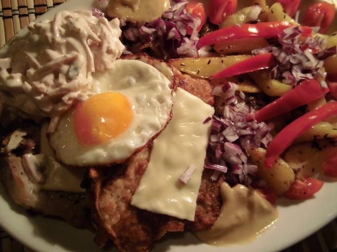 | Keywords: Kotleta s oblohou.JPG cs Kotleta s oblohou kotleta volské oko vlašský salát sýr cibule paprika rajče smažený česnek cibule hořčice 2012-12-30 18 24 36 own Makovec cc-zero Uploaded with UploadWizard Food of the Czech Republic Cutlets Olivier salad Home fries |