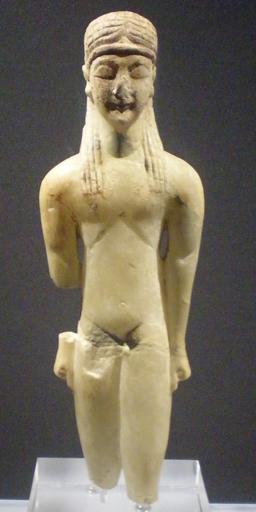 | Keywords: Kouros of Naucratis.jpg es Estatuilla de un kouros de yeso pintado versión en miniatura del kouros un prototipo de la escultura griega arcaica del siglo VI a C El cuerpo es una abstracción anatómica de un joven de excelencia física y moral areté cabello largo aristocrático hombros anchos cintura estrecha muslos fuertes y labios con una perenne sonrisa de satisfacción Conserva restos de pintura en el pelo y en el rostro Las esculturas de la época arcaica solían pintarse y había figuras masculinas como ésta que en ocasiones llevaban un bigote pintado Esta estatuilla probablemente manufactura chipriota procede de Naucratis Egipto Hacia 560 a C Medidas 257 mm x 88 mm x 44 mm GR 1888 1006 1 sculpture B438 own Dorieo 2009-04-16 Kouroi Naucratis Exposición La belleza del cuerpo MARQ 560s BC statues Taken with Nikon Coolpix S210 |