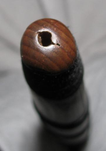 | Keywords: Kōwenewene pūtōrino - bottom fingerstop.jpg A close-up view of a Kōwenewene pūtōrino - the bottom aperture of a pūtōrino that is used as a fingerstop wenewene in playing When effected a microtonal difference in pitch is expressed This particular hole is around 4mm wide Some pūtōrino have a very much larger hole here while others have none at all The pūtōrino is a traditional Māori musical instrument own 2010-10-07 Tohunga puoro Tohunga puoro Maori musical instruments Files by User Tohunga puoro |