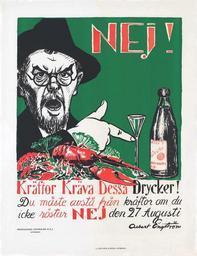 Keywords: Kräftor kräva dessa drycker-edit.jpg referendum on prohibition in 1922 The text in English Crawfishes demand these beverages You have to forego crawfishes unless you vote no on August 27 folkomröstningen om totalförbud mot alkoholdrycker 1922 http //www bukowskis com/ locale en Bukowskis 1922 Albert Engström Public domain Works by Albert Engström 1940 Albert Engström Prohibition in Sweden Political posters of Sweden Election posters in Sweden Crayfish as food August 1922 in Sweden 1922 events in Sweden Referendums in Sweden Referendums in 1922 |