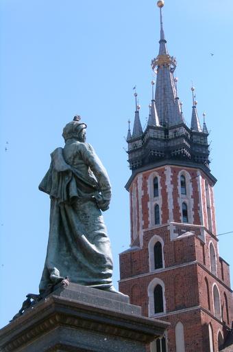 Keywords: Kraków - St. Mary tower and Mickiewicz monument.jpg Kraków Poland Own 2007-07 Rj1979 Adam Mickiewicz Monument in Kraków Exterior of Saint Mary Basilica in Kraków Sculptures in Poland Towers in Kraków Gothic church towers in Poland Kraków