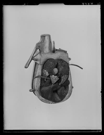 | Keywords: Kruthorn m kulpung Sachsen - Livrustkammaren - 2203.tif LSH artwork sv Pungformigt uppåt avsmalnande kruthorn med rak fram- och baksida Stomme av trä överklädd med svärtat läder Kantbeslag av stål längst ner sammanhållen med tvärgående skruv därnedanför på båda sidor tre skåror På framsidan kulpung av läder med dragsko graverad knapp av stål Lock av läder Treflikig nederkant ljusare skinnfoder knapphål På flikarna trekantiga fastnitade beslag av stål med mittskåra vågig överkant på spetsen svarvad knopp De yttre beslagen böjda mot mitten <br/>Krutmått av stål med yttre och inre slutning v-fjäder och ögleformig ventilarm på locket rak sarg med kantlinje Pipen 35 mm lång Fyra remöglor original caption kruthorn m kulpung Sachsen - LRK 3002 ca 1600 leather - steel - wood size mm 43 upptill g 275 size mm 73 size mm 51 nedtill size mm 82 LRK place of origin DE Saxony original filename LN_E00796 39603 inventory number LRK 3002 2203 CC0 Kruthorn m kulpung Sachsen - Livrustkammaren - 2203-negative tif <gallery caption Related objects > File Kruthorn m kulpung Sachsen - Livrustkammaren - 9035 tif LRK 3001 </gallery> Vessel container Media contributed by LSH dim-with multiple size templates Media contributed by LSH 2015-11 |