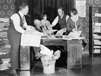 | Keywords: blackandwhite monochrome black and white The editorial staff of Kuluttajain Lehti at their offices. From the left: Untamo Utrio, editor-in-chief Hannes Uksila, Karoliina Otava, Eero Heinivaara and Lyyli Takki. / Kuluttajain Lehden toimitus työpaikallaan. Vasemmalta Untamo Utrio, päätoimittaja Hannes Uksila, Karoliina Otava, Eino Heinivaara ja Lyyli Takki. photographer unknown / kuvaaja tuntematon 1929 Helsinki, Uusimaa, Finland Finnish Museum of Photography / Suomen valokuvataiteen museo The editorial staff of Kuluttajain Lehti at their offices. From the left: Untamo Utrio, editor-in-chief Hannes Uksila, Karoliina Otava, Eero Heinivaara and Lyyli Takki. / Kuluttajain Lehden toimitus työpaikallaan. Vasemmalta Untamo Utrio, päätoimittaja Hannes Uksila, Karoliina Otava, Eino Heinivaara ja Lyyli Takki. photographer unknown / kuvaaja tuntematon 1929 Helsinki, Uusimaa, Finland Finnish Museum of Photography / Suomen valokuvataiteen museo |