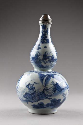 Keywords: Kurbitsformig porslinsflaska från Kina med skruvlock och mynningsbeslag av silver gjord cirka 1645-1655 - Hallwylska museet - 95596.tif LSH artwork sv FLASKA med kupigt skruvlock och mynningsbeslag av silver Kurbitsformig på fotkant nedre delen sfärisk den övre päronformig och utdragen i en smal hals med något utsvängd mynning På nedre delen dekor med figurer i ett landskap Upptill en bård av blommor mellan dessa stora och små blad På halsen två grupper med en tulpanliknande blomma mellan dessa bladornament Underglasyrmålning i blåvitt på fotkanten blottor samt rester efter strösanden <br/>Dekoren föreställer antagligen scenen Ho shao Po-wang - brännandet av berget Po-wang ur den berömda romanen San kuo chï yen i av Lo Kuan-Chung <br/>Inköpt av Wilhelmina von Hallwyl från konsthandlaren J Bosshard Luzern genom herr Carl Ulrik Palm 1911 <br/>Bottle Late Ming Scenes from Ho shao Po-wang original caption Kurbitsformig porslinsflaska från Kina med skruvlock och mynningsbeslag av silver gjord cirka 1645-1655 <br/> Nyckelord flaska keramik Kinesiskt porslin Föremålsbild Ming - 1645 1655 size cm 34 HWY place of origin CN original filename hm_dig12100 15402 inventory number HWY XLVIII VIII B b c 02 95596 CC-BY-SA Jens Mohr Porcelain of China Ming Dynasty Ceramics Chinese ceramics in the Hallwyl Museum Sweden Jens Mohr Gourd-shaped bottles Collections of Hallwylska museet Media contributed by LSH 2014-11 |
