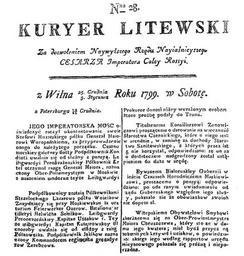| Keywords: Kurier Litewski 1799 n 28 - newspaper.jpg en first page of newspaper Kuryer Litewski 28 1799 AD Russian empire ru пе вая ст аница газеты Kuryer Litewski 28 1799 г на польском языке be пе шая ста онка газеты Kuryer Litewski 28 1799 г на польскай мове newspaper Kuryer Litewski 28 1799 AD Russian empire page 1 own work 2013 free public domain Газеты на польскай мове Газеты Рэчы Паспалітай Газеты Расійскай імпе ыі Газеты Бела усі Газеты Літвы Cc-zero Uncategorized 2013 January 24 | ||||