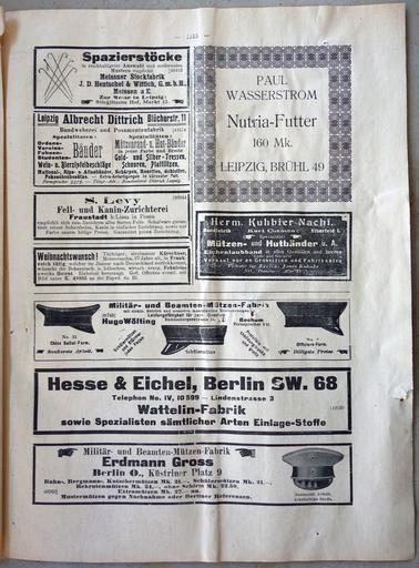 | Keywords: Kürschner-Zeitung No. 25, Leipzig 08. Dezember 1912 (23).jpg Kürschner-Zeitung Nr 25 vom 8 Dezember 1912 Verlag von Alexander Duncker Leipzig Seite 1613 J D Hentschel Wittich Meissen a/E Stockfabrik Albrecht Dittrich Berlin Bandweberei und Posamentenfabrik S Levy Fraustadt b/Lissa in Posen Fell- und Kanin-Zurichterei Paul Wasserström Leipzig Nutria-Futter Herm Kuhbier Nachf Elberfeld Mützen- und Hutbänder Hugo Wölting Bochum Mützen-Fabrik Hesse Eichel Berlin Wattelin-Fabrik Erdmann Gross Berlin Mützen-Fabrik Collection Kuhn 1912-12-08 Redaktion Kürschner-Zeitung u a PD-old Kürschner-Zeitung No 25 Leipzig 08 Dezember 1912 1613 Fur dressers in Leszno Ingredients fur traders in Germany Hesse Eichel Weavers Fur wholesale dealers in Leipzig Wasserstrom Paul Hatters of Germany Fur dressers in Germany Levy S |