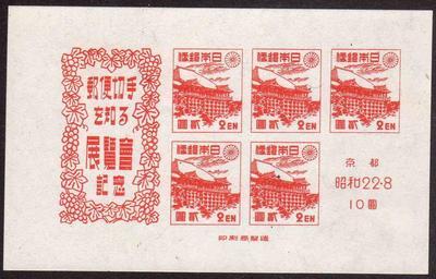 Keywords: Kyoto Philatelic Exhibition in 1947.jpg en Kyoto Philatelic Exhibition in 1947 ja 1947年8 に京都で開催された 郵便切手を知る展覧会記念 の2円の清水寺切手5枚を納めた小型シート 発行後50年以上経過している為 著 権 護 間終了 日 国郵政 Carpkazu 1947-08-19 PD-Japan Stamps of Japan 1947 Miniature sheet of Japan Stamp exhibitions on stamps Main Hall Kiyomizu-dera History of Kyoto |
