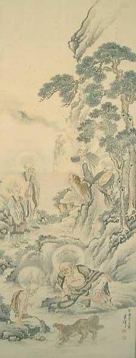 | Keywords: Kyoyo Six Sennin.jpg Kyōyō Six Sennin 1914 Sumi ink and soft colors on silk 22 x 75 The painting depicts six sennin or Taoist immortals in ragged clothing and living in the mountains of China One unleashes his spirit as a dragon another presents a carving of Daruma while two others speak with a creature of Chinese mythology From http //www trocadero com/Kris/items/85308/en3 html here PD-Art Art of the Prewar Japan Xian Taoism Japanese dragons Mythology of Japan Paintings on scrolls from Japan Taoism in Japan 1914 paintings 1914 in Japan Kyōyō Sennin Artworks missing infobox template |