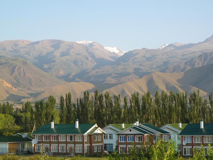 Keywords: kyrgyz republic landscape mountains sky clouds apartments architecture buildings valley trees outside country countryside summer spring