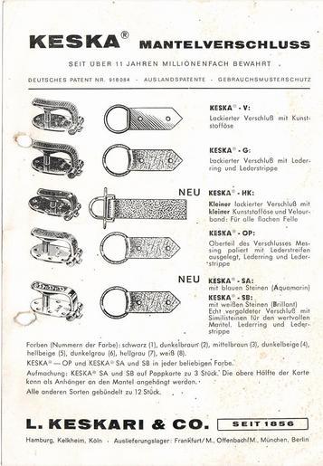 | Keywords: L. Keskari CO Keska-Pelz-Verschluss, Karte.tif Pelz-Klipverschluss der Firma C Keskari der žKeska 1952 wurde er erstmals auf der Pelzmesse in Frankfurt am Main angeboten Der Begriff Keska ist noch heute 2011 in der deutschen Pelzbranche als ein Allgemeinbegriff für einen Pelzklipverschluss gebräuchlich Keska Mantelverschluss seit über 11 Jahren millionenfach bewährt Fur coat fastener Own family own design ca 1963 Firma Keskari PD-heirs <gallery>File L Keskari CO Keska-Pelz-Verschluss Modell OP jpg</gallery> Keskari fur traders Furriers technology Snap fasteners |