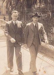 | Keywords: guy lynch guylynch frank lynch franklynch joe lynch joelynch rupert ingleby rupertingleby (L) "Guy" Frank Lynch - (R) Rupert Ingleby c 1940 Frank “Guy” Lynch 1895-1967 This photograph c 1940 [L] Guy Lynch [R] Rupert Ingleby was possibly taken in Sydney. In those days it was common for professional ‘street photographers’ to offer their photographic services on the streets in major cities. My grandfather Bernard Ingleby 1878-1941 was an Advertising writer and part time poet who published 42 poems, most in The Bulletin and one in The Lone Hand, between 1904 to 1928. As a result he had close ties with the artistic people of the period 1910 to 1940 in Melbourne and Sydney, including sculptor - Guy Lynch, Artist - Unk White, Poets - Henry Lawson, Victor James Daly, John Keith McDougal and Garry Lyle. Artists – Percy Lindsay (best man at Bernards’ 1905 wedding in Melbourne, although family legend apparently wrongly claimed that Henry Lawson was the best man], Walter Hobbs, Edgar James Turner and Jack Sommers [artist & poet]. My parents Rupert & Una Ingleby were close friends of Guy Lynch and Unk White, initial contact most likely as a result of Bernard’s connection with The Bulletin and his socialising with the many artists and poets who had their work published in it. As a 19 year old, in 1897-1898 Bernard was an ‘observer’ in Clement Wragge’s meteorological observatory, first an arctic tent, then a hut on the summit of Mount Kosciuszko. Guy was born in Melbourne, Victoria and the family moved to Auckland, New Zealand and in 1915, he fought at Gallipoli and in France. He moved to Australia in 1922 with his brother Joe Lynch, a cartoonist. Joe and Unk White used to sketch people on the streets of Auckland. In 1929 Guy studied in London at the Royal College of Arts. His sculptures include: 1931 a bust of writer Beverley Nichols, 1938 a bust of Sir Isaac Isaacs, Paris - a bust of Lieutenant General Baron Birdwood - before returning to Sydney in 1938. The war memorial in Devonport, NZ has a statue of the ‘untidy soldier.’ Other works include “Australian Venus,” and “The Digger” he made a bust of Dame Nellie Melba’s grand-daughter Pamela and a garden sculpture “Victory of Orpheus.” He later created the figures for the battle diorama ‘Pozieres’ at the Australian War Memorial, Canberra. The three (3) large doors fitted to the Mitchell wing of the SLNSW, have 18 panels incorporated into each of the doors. The left door is of Aboriginal heritage, the middle door is of Explorers and the right door is Aboriginal heritage. The panel Guy created is on the right door and is titled, ‘Carrying the euro – Luritja Tribe.’ In 1924 he created The Satyr - being a large plaster sculpture held at the Art Gallery of NSW for which his brother Joe was the model. It was displayed at the Art gallery in 1989 in an exhibition titled, ”Stampede of the lower gods.” In 1927, Joe fell off a ferry in Sydney harbour and drowned. Joe had been on his way to a bohemian party at the Mosman home of George & Natalie Finey with a group of artists. (Ref: Poetry of Place, Royal Botanic Gardens, Sydney by Edwin Wilson) In 1977 Guy’s wife Madge had a smaller bronze cast made from The Satyr and it was erected in the Royal Botanic Gardens near the gates, directly behind the Sydney Opera House, where it looks out onto the harbour to the spot where Joe drowned. Poet, Kenneth Slessor wrote an emotive poem titled ‘Five Bells’ about Joe’s drowning. Ref: adb.anu.edu.au/biography/lynch-francis-ennis-guy-10878 and mjedmo.wordpress.com/2012/02/22/talking-about-joe-lynch/ (L) "Guy" Frank Lynch - (R) Rupert Ingleby c 1940 Frank “Guy” Lynch 1895-1967 This photograph c 1940 [L] Guy Lynch [R] Rupert Ingleby was possibly taken in Sydney. In those days it was common for professional ‘street photographers’ to offer their photographic services on the streets in major cities. My grandfather Bernard Ingleby 1878-1941 was an Advertising writer and part time poet who published 42 poems, most in The Bulletin and one in The Lone Hand, between 1904 to 1928. As a result he had close ties with the artistic people of the period 1910 to 1940 in Melbourne and Sydney, including sculptor - Guy Lynch, Artist - Unk White, Poets - Henry Lawson, Victor James Daly, John Keith McDougal and Garry Lyle. Artists – Percy Lindsay (best man at Bernards’ 1905 wedding in Melbourne, although family legend apparently wrongly claimed that Henry Lawson was the best man], Walter Hobbs, Edgar James Turner and Jack Sommers [artist & poet]. My parents Rupert & Una Ingleby were close friends of Guy Lynch and Unk White, initial contact most likely as a result of Bernard’s connection with The Bulletin and his socialising with the many artists and poets who had their work published in it. As a 19 year old, in 1897-1898 Bernard was an ‘observer’ in Clement Wragge’s meteorological observatory, first an arctic tent, then a hut on the summit of Mount Kosciuszko. Guy was born in Melbourne, Victoria and the family moved to Auckland, New Zealand and in 1915, he fought at Gallipoli and in France. He moved to Australia in 1922 with his brother Joe Lynch, a cartoonist. Joe and Unk White used to sketch people on the streets of Auckland. In 1929 Guy studied in London at the Royal College of Arts. His sculptures include: 1931 a bust of writer Beverley Nichols, 1938 a bust of Sir Isaac Isaacs, Paris - a bust of Lieutenant General Baron Birdwood - before returning to Sydney in 1938. The war memorial in Devonport, NZ has a statue of the ‘untidy soldier.’ Other works include “Australian Venus,” and “The Digger” he made a bust of Dame Nellie Melba’s grand-daughter Pamela and a garden sculpture “Victory of Orpheus.” He later created the figures for the battle diorama ‘Pozieres’ at the Australian War Memorial, Canberra. The three (3) large doors fitted to the Mitchell wing of the SLNSW, have 18 panels inco