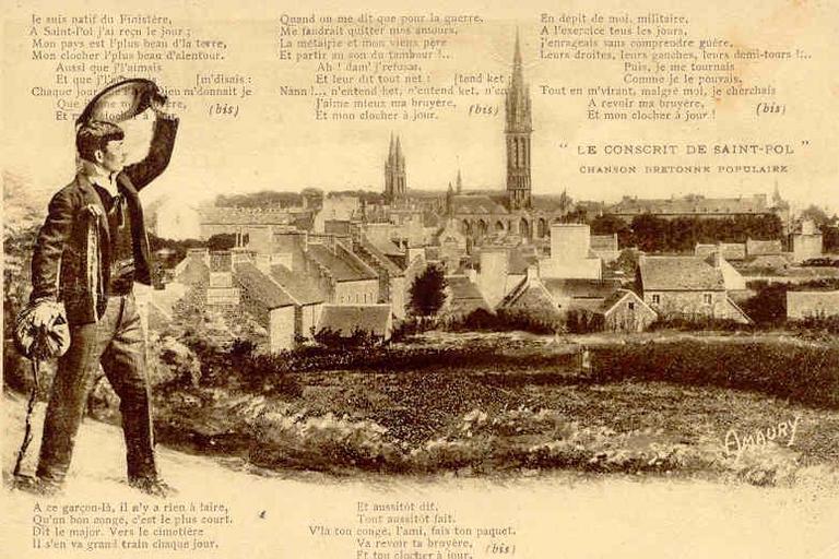 Keywords: La chanson du conscrit.jpg fr carte postale Le conscrit de Saint-Pol chanson populaire bretonne Je suis natif du Finistère A Saint-Pol j'ai reçu le jour Mon pays est l'plus beau d'la terre Mon clocher l'plus beau d'alentour Aussi j' l'aimais et j' l'admirais Chaque jours qu'Dieux me donnait j'me disais Que j'aime ma bruyère Et mon clocher à jour Quand on me dit que pour la guerre Me faudrait quitter mes amours La métairie et mon vieux père Et partir au son des tambours Ah Dam' J'refusais Et leur dit tout net Nam J'n'entends guet n'entend ket J'aime mieux ma bruyère Et mon clocher à jour Collection personnelle Collection personnelle 1940 PD-old History of Saint-Pol-de-Léon France Education and culture in Saint-Pol-de-Léon Postcards of Finistère 1940 postcards 1940 in Bretagne Songs of Brittany Conscription in World War II Chapelle Notre-Dame du Kreisker Men of France 1940s postcards of Bretagne |