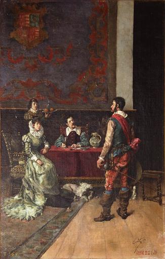 | Keywords: La despedida, de Juan Jiménez Martín (Museo del Prado).jpg La obra representa a un caballero del siglo XVII despidiéndose de una dama y otro hombre que se hallan sentados ante una mesa 1882 oil on canvas Size cm 41 62 Institution Museo del Prado Depositado en la Institution University of Córdoba https //www museodelprado es/coleccion/obra-de-arte/la-despedida/b83f3875-0028-4721-a154-b518327c630b searchid 55345bae-4778-2277-95ed-0718d3e635a9 accession number P07811 https //content3 cdnprado net/imagenes/Documentos/imgsem/b8/b83f/b83f3875-0028-4721-a154-b518327c630b/64299bdb-1779-4107-b3f3-a083c4756a74 jpg PD-old-100 Juan Giménez Martín Spanish 19th-century paintings in the Museo del Prado Paintings in the University of Córdoba Spain 1882 paintings in Spain |
