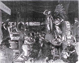 Keywords: La Mi-Carême dans un lavoir de Plaisance vers 1870.jpg fr Gravure figurant la fête des blanchisseuses à Paris dans un lavoir du quartier Plaisance XIVème arrondissement Presse parisienne 1870 M Vierge 1870 Domaine public Aucune présentement PD-Art Carnaval de Paris Bals du Carnaval de Paris |