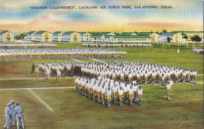 Keywords: Lackland Air Force Base - Aviation Cadet Calisthenics.jpg en Lackland Air Force Base - Aviation Cadet Calisthenics 1948 United States Air Force United States Air Force other versions PD-USGov Lackland Air Force Base Postcards Uploaded with UploadWizard |