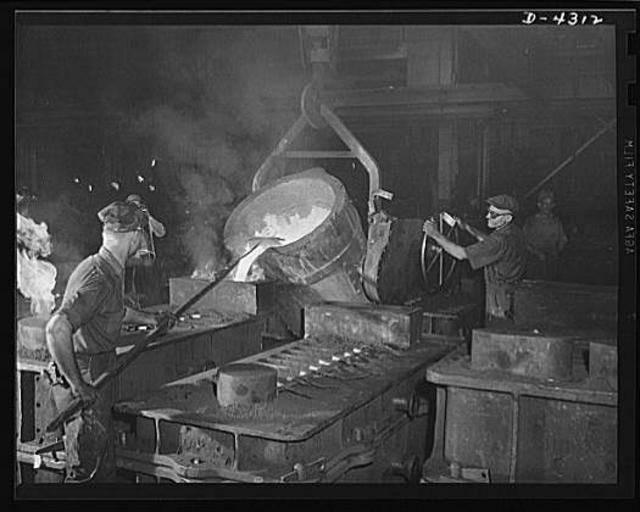 Keywords: Ladle skimming at New Foundry.png en wikipedia 2009 October 29 Photo taken by U S Government Worker in January 1942 Production Milling machines and machine castings Pouring a large mold is a fiery sight To the left flames are shooting from an escape hole -- caused by gas generated by the contact of iron with the relatively cool sand graphite linseed oil and other ingredients involved in the mold structure The man at the left is wielding a skimmer to hold back any impurities floating on the surface of the ladle iron FSA photo by Alfred Palmer Via original text 1 The Library of Congress American Memory website 1942-01 Alfred T Palmer http //www loc gov/homepage/legal html page is/was http //en wikipedia org/w/index php title Image 3ALadle_skimming_at_New_Foundry png here All following user names refer to en wikipedia 2009-02-15 21 24 Mfields1 525×420× 115194 bytes <nowiki> Photo taken by U S Government Worker in January 1942 Production Milling machines and machine castings Pouring a large mold is a fiery sight To the left flames are shooting from an escape hole -- caused by gas generated b</nowiki> 1942 in the United States Manufacturing companies of the United States Skimming Photographs by Alfred T Palmer |
