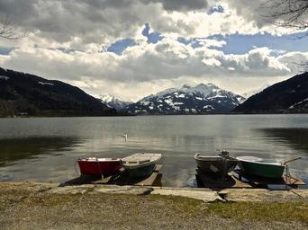 Keywords: lake boats mountains sky solitude quiet zeller see zell am see austria tranquil peaceful water view