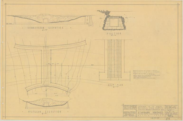 Keywords: lake corpus christi state park lakecorpuschrististatepark texas state parks texasstateparks ccc civilian conservation corps civilianconservationcorps sketch drawing text document writing Title: Standard Bridges Specific Date: 9/18/1934 Architect: Bones, J. William, draftsman Remarks: Pencil on paper showing Standard bridges, including section, half plan, downstream elevation and upstream elevation. Dimensions: LN: 32.625" x WD: 21.625" Title: Standard Bridges Specific Date: 9/18/1934 Architect: Bones, J. William, draftsman Remarks: Pencil on paper showing Standard bridges, including section, half plan, downstream elevation and upstream elevation. Dimensions: LN: 32.625" x WD: 21.625" |