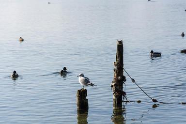 Keywords: lake gmunden traunsee mirroring fog nature water quiet rest austria animals gull duck wooden posts post leash wave