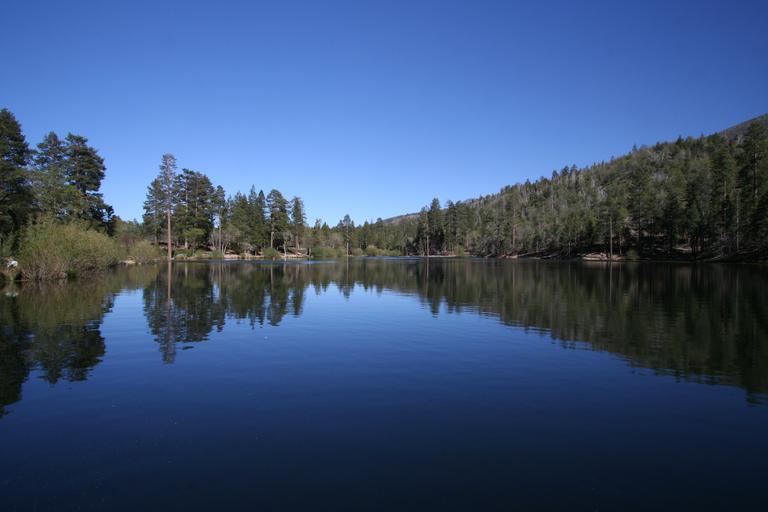Keywords: lake jenks lake blue sky reflections on the water forest dark blue water coniferous reflection mirror effect santa ana river channel undergrowth wood fir trees field mountain hills plants vegetation flora nature landscape angelus oaks california united states wallpaper