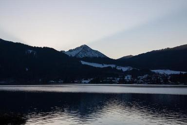 Keywords: lake mountains panorama bank sky water blue rest dusk landscape nature winter mirroring