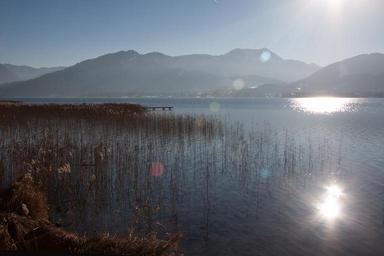 Keywords: lake mountains panorama bank sky water blue rest sunny sun mirroring landscape nature web boardwalk winter haze reed phragmites australis grass poaceae marsh plant bluegrass